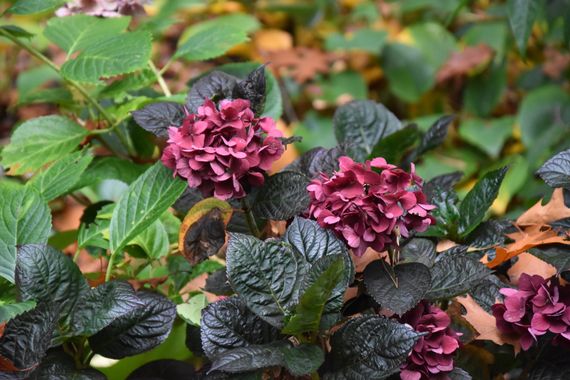 Inflorescence en boule, Rouge bordeaux avec un feuillage vert foncé qui se teinte de rouge à l’automne.